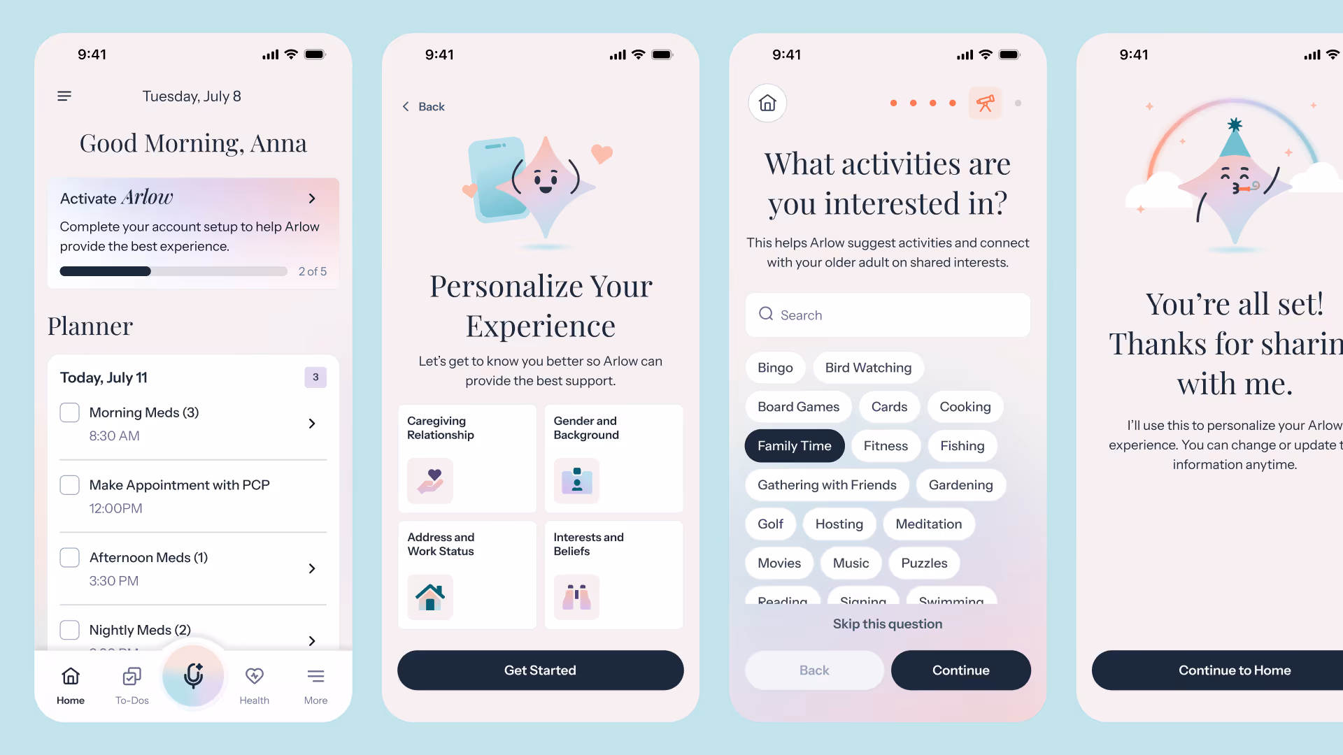 Arlow helps aging adults and caregivers manage daily care through shared coordination and an AI companion designed to guide, support, and simplify complex moments.